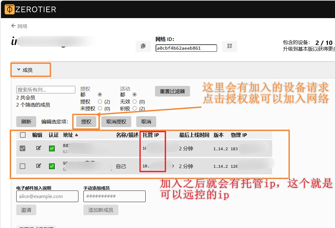 例子:在ZeroTier网页后台添加一个网络,就是在两个设备下载ZeroTier客户端,两个设备都加入到网络,就形成了一个局域网,最后在网页后台进行设备加入的授权加入,就会形成一个ip,只需要输入这个ip就可以实现远控了。